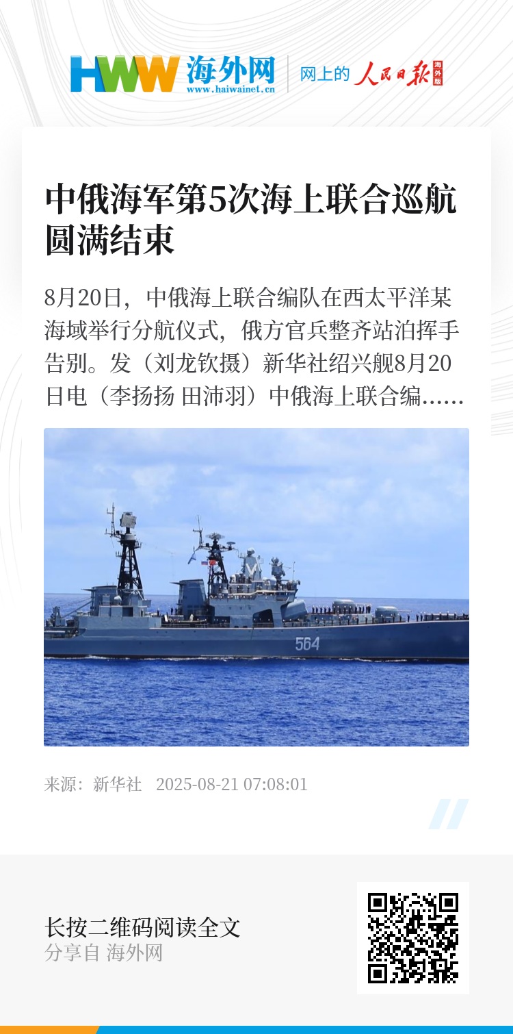 新华社绍兴舰8月20日电(李扬扬 田沛羽)中俄海上联合编队20日上午在西太平洋某海域举行分航仪式。经过为期15天的联合巡航后,双方舰艇编队按计划分航,中俄海军第5次海上联合巡航圆满结束。