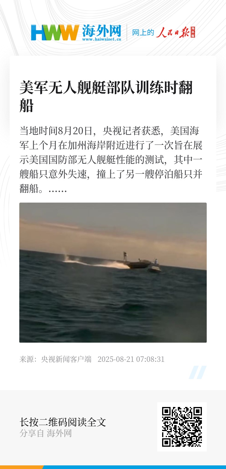 几周前,在美国海军的另一项测试中,一艘支援艇拖曳的另一艘船舶突然加速,发生倾覆事故。知情人士称,这两起事件均由软件故障和人为失误共同导致,包括船上系统与外部自主软件之间的通信中断。(央视记者 刘骁骞)