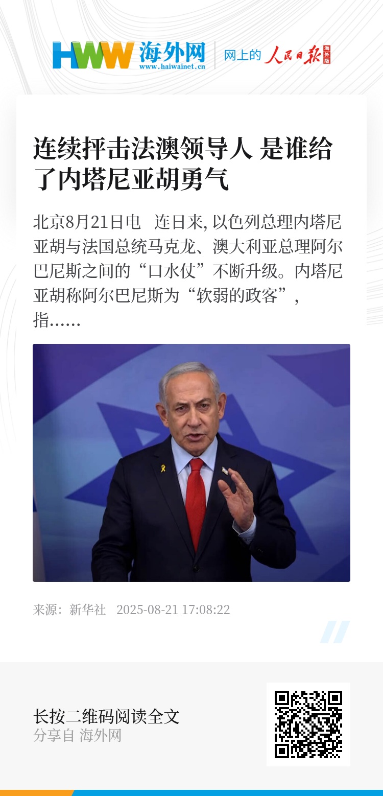 新华社北京8月21日电 连日来,以色列总理内塔尼亚胡与法国总统马克龙、澳大利亚总理阿尔巴尼斯之间的“口水仗”不断升级。内塔尼亚胡称阿尔巴尼斯为“软弱的政客”,指责其“背叛以色列”,同时指责马克龙“给反犹主义火上浇油”。