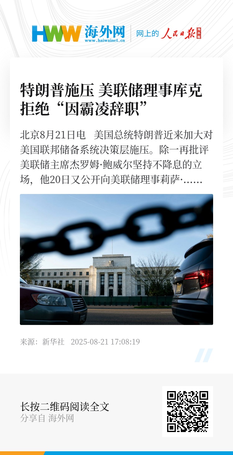 新华社北京8月21日电 美国总统特朗普近来加大对美国联邦储备系统决策层施压。除一再批评美联储主席杰罗姆·鲍威尔坚持不降息的立场,他20日又公开向美联储理事莉萨·库克“喊话”,要求库克辞职。