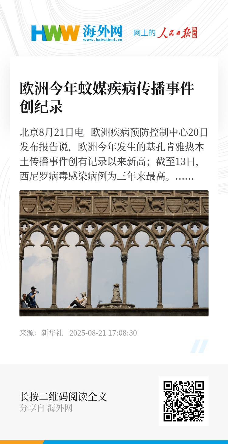 新华社北京8月21日电 欧洲疾病预防控制中心20日发布报告说,欧洲今年发生的基孔肯雅热本土传播事件创有记录以来新高;截至13日,西尼罗病毒感染病例为三年来最高。该机构警告,气候变化或令蚊媒疾病传播成为“新常态”。