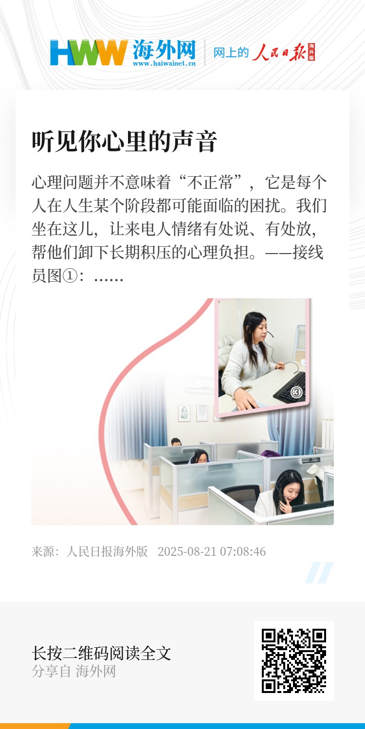 从此,热线两端,是倾诉与聆听、困顿与陪伴、求助与回应,连接起的是一些人需要被理解、被看见的时刻;热线背后,是一道接线员悉心守护的心灵缓冲带,也是一张面向全民的心理健康服务网络。