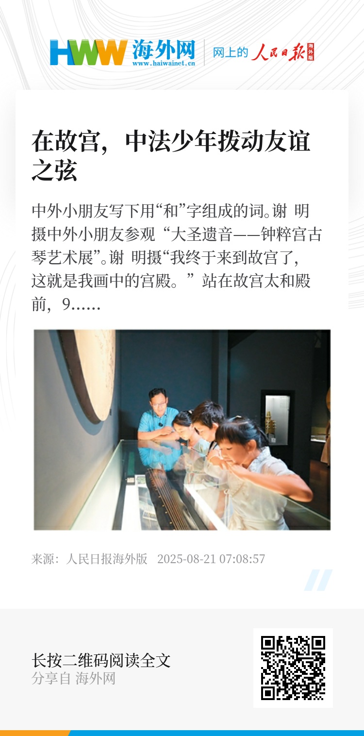 近日,人民日报海外版与故宫博物院合作举办中法儿童古琴交流活动。罗雨果在跟随妈妈回中国度假期间,与两名中国小朋友一起参加活动,逛故宫、学古琴,体验多姿多彩的中国文化,在真挚的交流中收获美好的友谊。