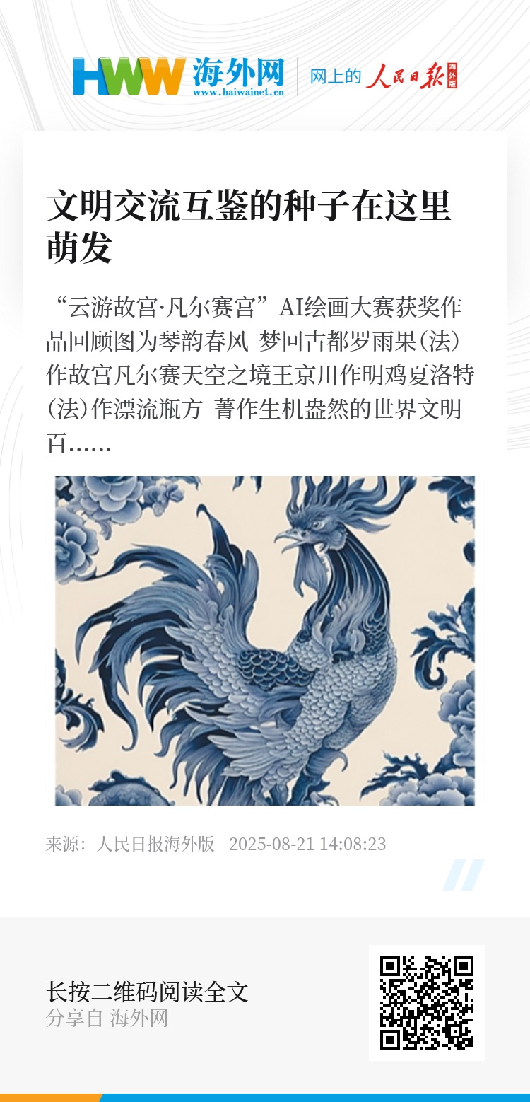 生机盎然的世界文明百花园,需要不同文明相互尊重、互学互鉴。2024年,由人民日报海外版与故宫博物院共同主办的“云游故宫·凡尔赛宫”AI绘画大赛,吸引了五大洲的作者投稿近4000件,最终有38位中外作者获奖。