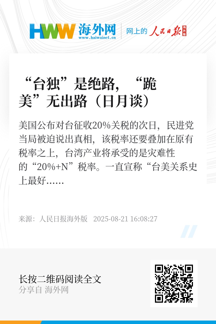 从“凯子军购”到“莱猪莱牛”,从台积电赴美且被要求加码投资,到大幅开放美国产品入台,民进党当局长期任美国予取予求,换到了什么?换来的不过是口惠而实不至的“挺台”虚言,是“炸毁台积电”的恶意,是“以台制华”的棋子地位和用过即丢的弃子风险。此次美国对台甩关税大耳光,延续的不过是台美互动的一贯逻辑,只不过剧情更炸裂,连过去虚情假意的掩饰都没了。