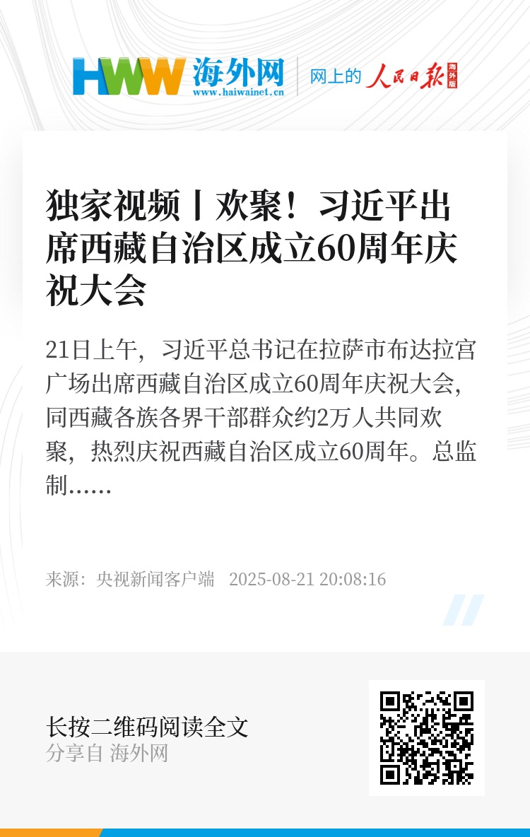 21日上午,习近平总书记在拉萨市布达拉宫广场出席西藏自治区成立60周年庆祝大会,同西藏各族各界干部群众约2万人共同欢聚,热烈庆祝西藏自治区成立60周年。