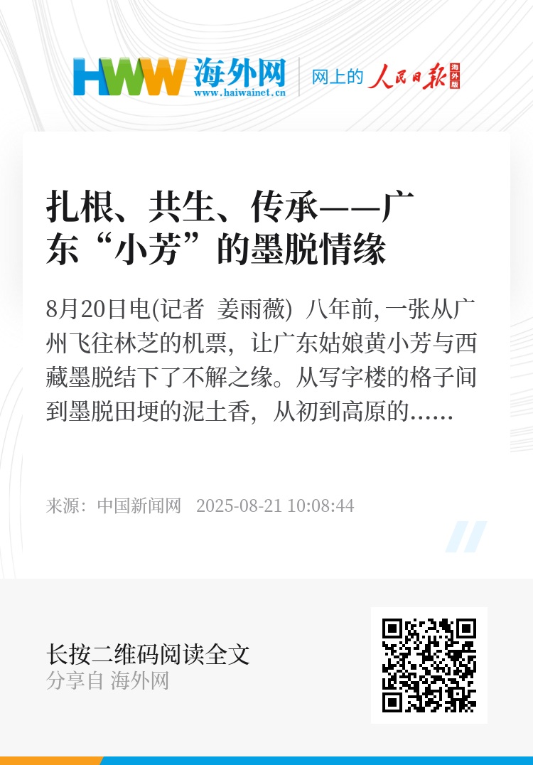 中新网8月20日电(记者 姜雨薇) 八年前,一张从广州飞往林芝的机票,让广东姑娘黄小芳与西藏墨脱结下了不解之缘。