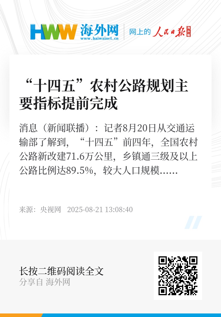 央视网消息(新闻联播):记者8月20日从交通运输部了解到,“十四五”前四年,全国农村公路新改建71.6万公里,乡镇通三级及以上公路比例达89.5%,较大人口规模自然村(组)通硬化路比例达94.6%,提前完成了“十四五”规划主要指标。