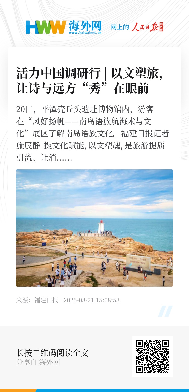 19日至20日,“活力中国调研行”记者走进莆田市荔城区西天尾镇北大村、平潭壳丘头博物馆和平潭22号国际游艇码头,切身感受文化赋能旅游业的生动图景。