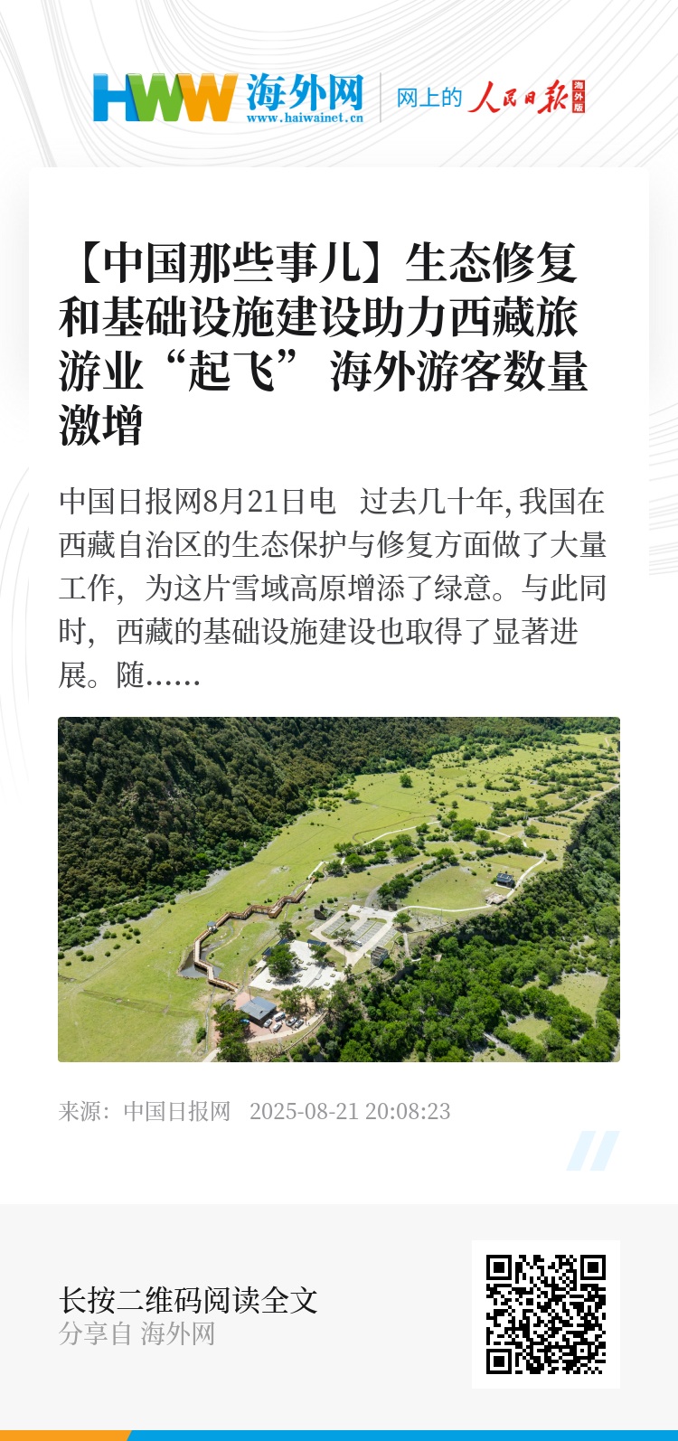 中国日报网8月21日电 过去几十年,我国在西藏自治区的生态保护与修复方面做了大量工作,为这片雪域高原增添了绿意。与此同时,西藏的基础设施建设也取得了显著进展。随着美丽西藏建设的深入推进,西藏的旅游业蓬勃发展,海外游客数量快速增长。