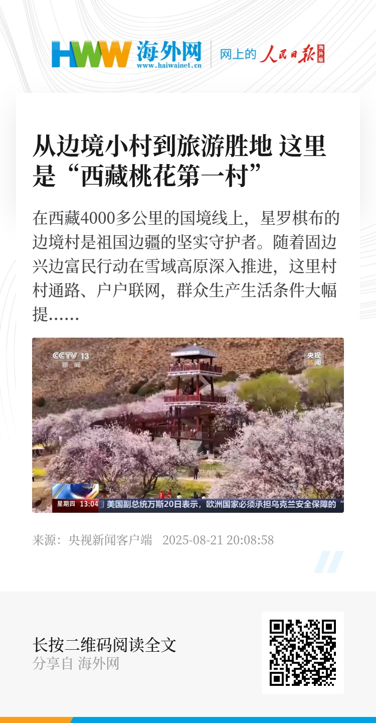 在西藏4000多公里的国境线上,星罗棋布的边境村是祖国边疆的坚实守护者。随着固边兴边富民行动在雪域高原深入推进,这里村村通路、户户联网,群众生产生活条件大幅提升,特色产业蓬勃兴起,正绘就一幅边防巩固、边境安宁、边民幸福的新时代画卷。