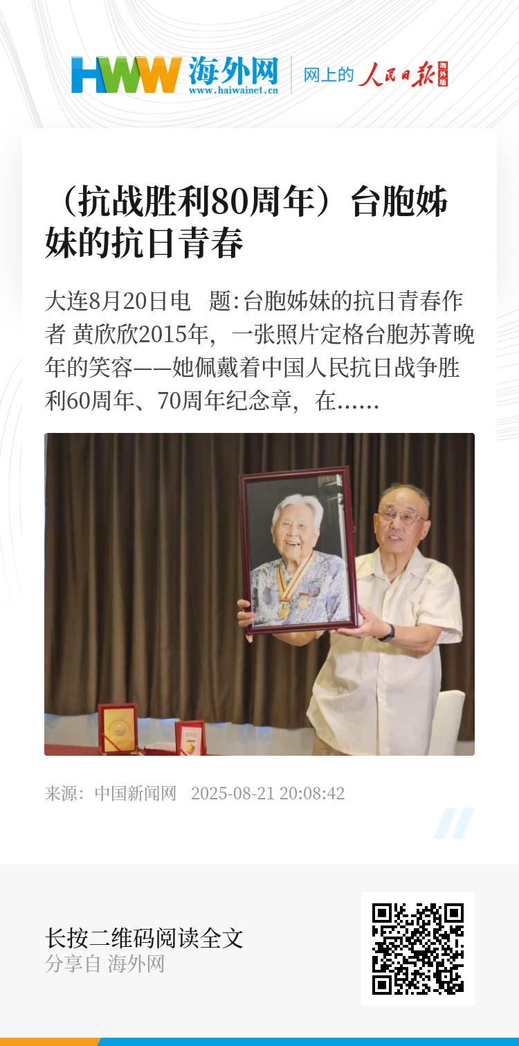 2015年,一张照片定格台胞苏菁晚年的笑容——她佩戴着中国人民抗日战争胜利60周年、70周年纪念章,在镜头前开怀大笑。彼时,阿尔兹海默症已逐渐影响她的记忆,但她作为革命者的自豪依然鲜活。