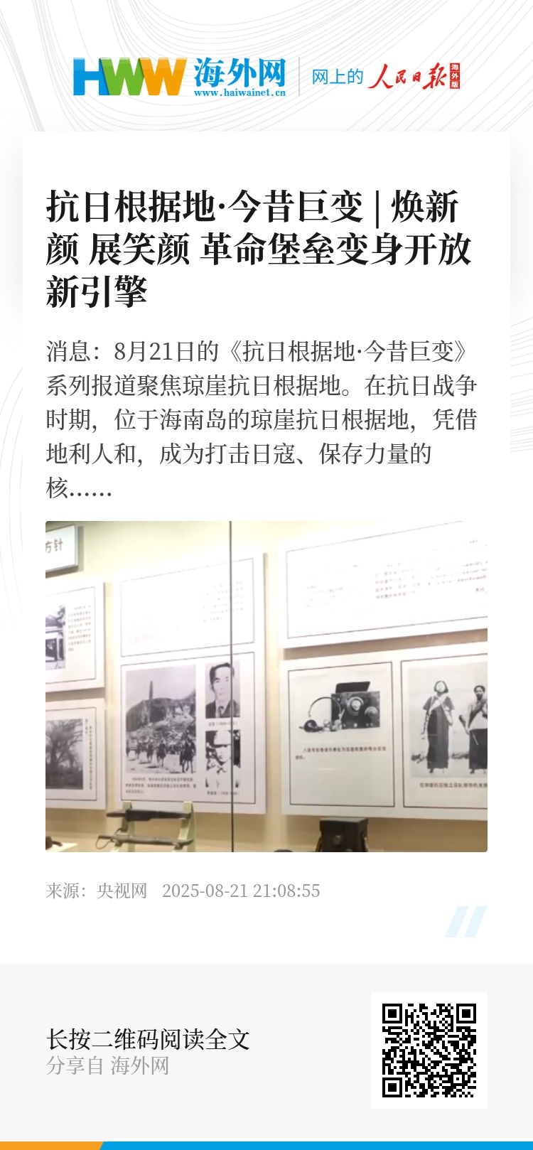 央视网消息:8月21日的《抗日根据地·今昔巨变》系列报道聚焦琼崖抗日根据地。在抗日战争时期,位于海南岛的琼崖抗日根据地,凭借地利人和,成为打击日寇、保存力量的核心堡垒。如今,这片承载着热血记忆的革命热土已焕发崭新容颜,与海南自贸港的蓬勃建设同频共振。昔日打击日寇的沙场正崛起为开放前沿,赓续着奋斗精神,描绘着时代发展的壮阔蓝图。接下来,一起走进这片热土,看看这里的今昔巨变。