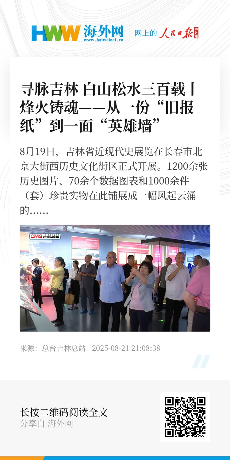 8月19日,吉林省近现代史展览在长春市北京大街西历史文化街区正式开展。1200余张历史图片、70余个数据图表和1000余件(套)珍贵实物在此铺展成一幅风起云涌的历史长卷,全景呈现自1644年清军入关至20世纪50年代末吉林三百年的风雨征程。这里,有侵略者在东北大地烙下的铁证罪行,亦有吴大澂等仁人志士寸土必争的戍边担当;有东北抗联将士14年浴血奋战的艰苦卓绝,亦有“三地三摇篮”孕育的奋斗华章。岁月更迭,吉林的苦难与辉煌在这里回响。中央广播电视总台吉林总站推出系列节目《寻脉吉林 白山松水三百载》,循着这些历史印记,探寻吉林人民在苦难中坚守、在开拓中前行的精神史诗。