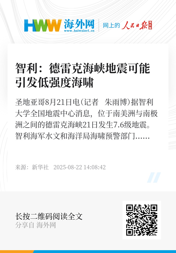 新华社圣地亚哥8月21日电(记者 朱雨博)据智利大学全国地震中心消息,位于南美洲与南极洲之间的德雷克海峡21日发生7.6级地震。智利海军水文和海洋局海啸预警部门发布预警说,此次地震可能引发低强度海啸。