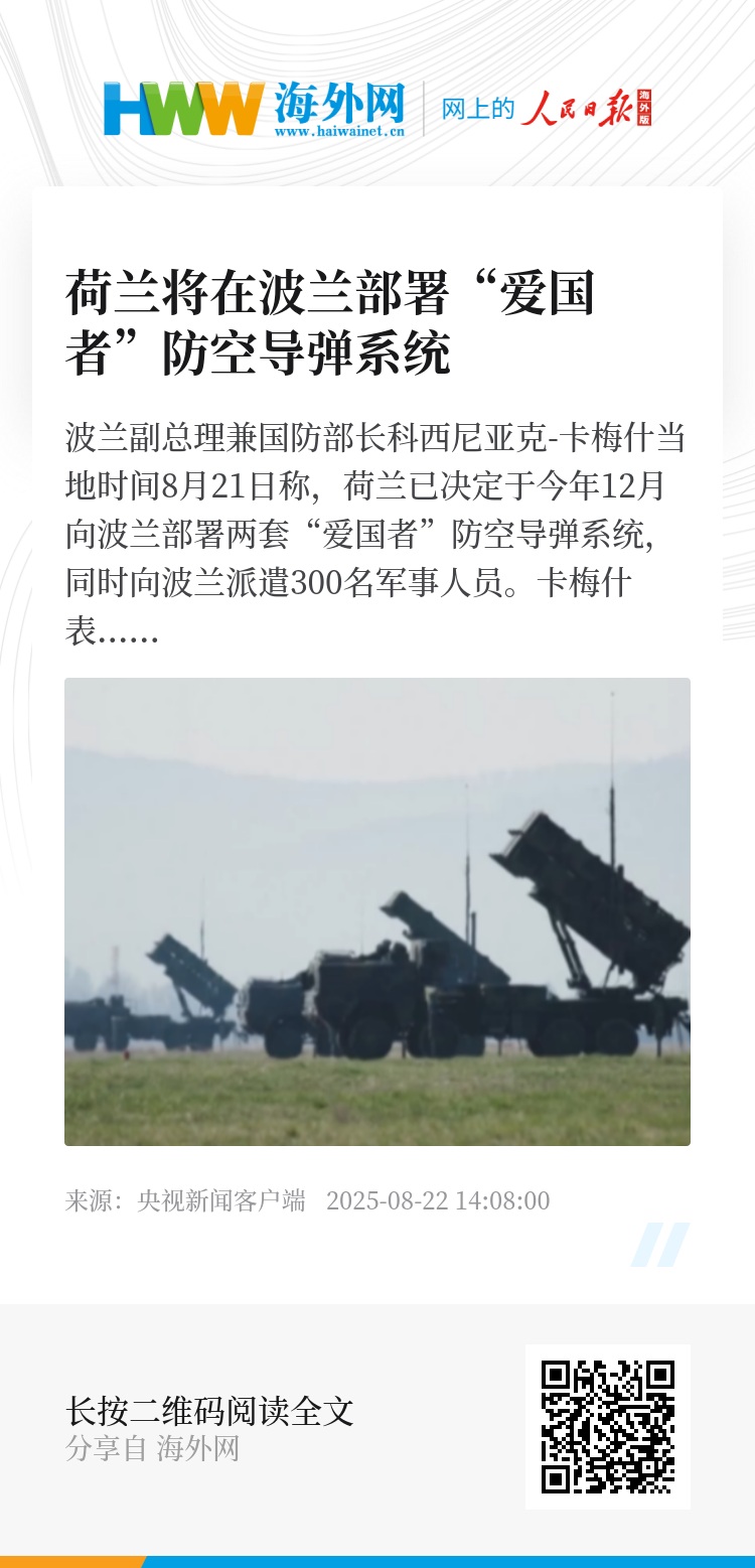 波兰副总理兼国防部长科西尼亚克-卡梅什当地时间8月21日称,荷兰已决定于今年12月向波兰部署两套“爱国者”防空导弹系统,同时向波兰派遣300名军事人员。