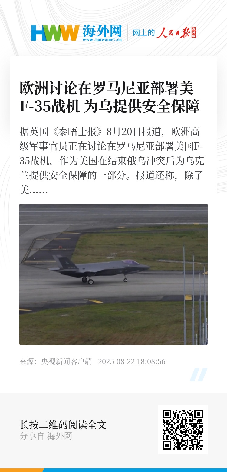 据英国《泰晤士报》8月20日报道,欧洲高级军事官员正在讨论在罗马尼亚部署美国F-35战机,作为美国在结束俄乌冲突后为乌克兰提供安全保障的一部分。