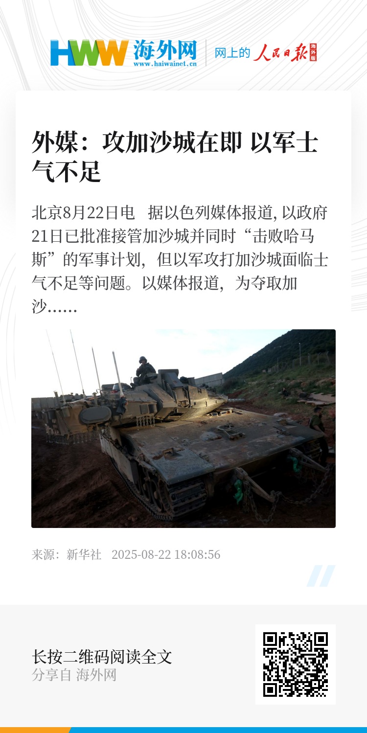 新华社北京8月22日电 据以色列媒体报道,以政府21日已批准接管加沙城并同时“击败哈马斯”的军事计划,但以军攻打加沙城面临士气不足等问题。