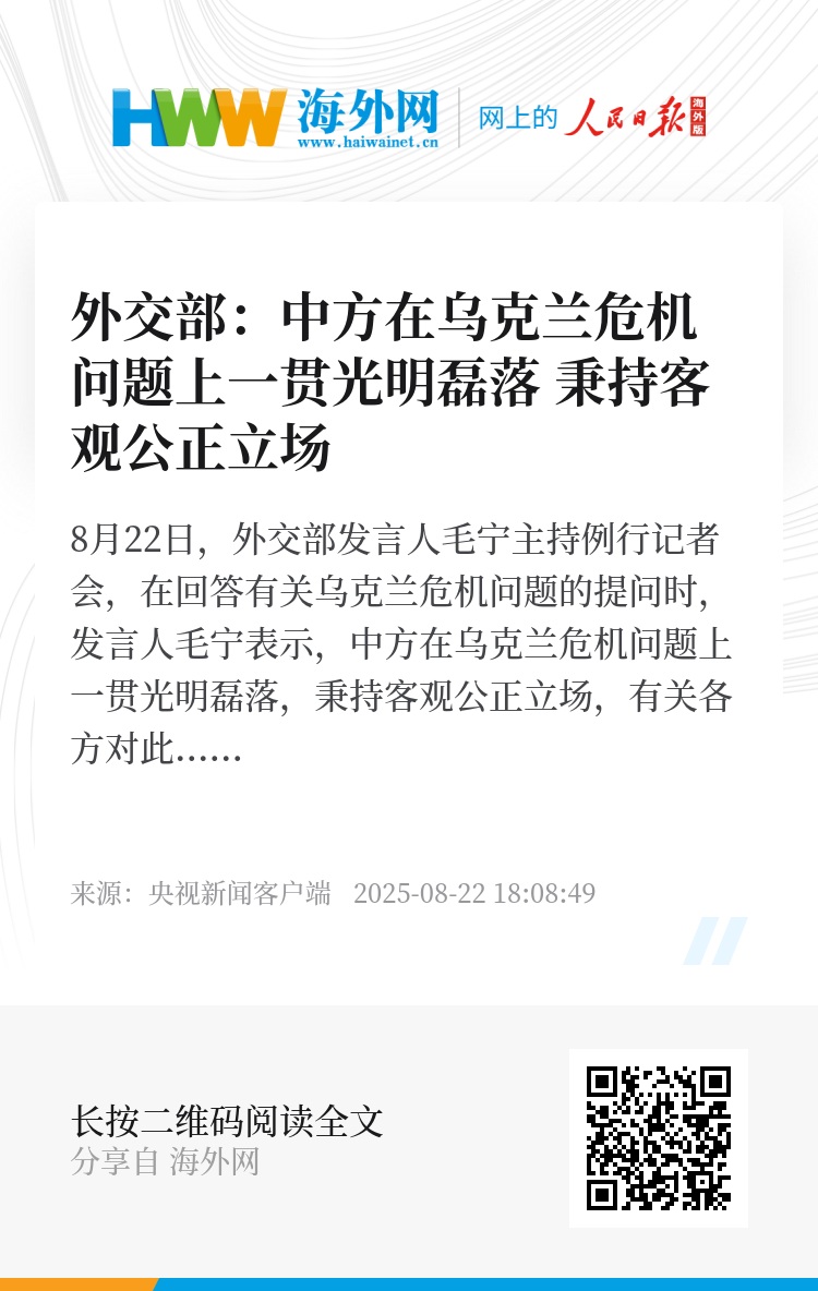 8月22日,外交部发言人毛宁主持例行记者会,在回答有关乌克兰危机问题的提问时,发言人毛宁表示,中方在乌克兰危机问题上一贯光明磊落,秉持客观公正立场,有关各方对此是清楚的。我们认为各方应当本着共同、综合、合作、可持续的安全观,推动乌克兰危机的政治解决。中方愿意为此发挥建设性作用。(总台央视记者 张雪松)