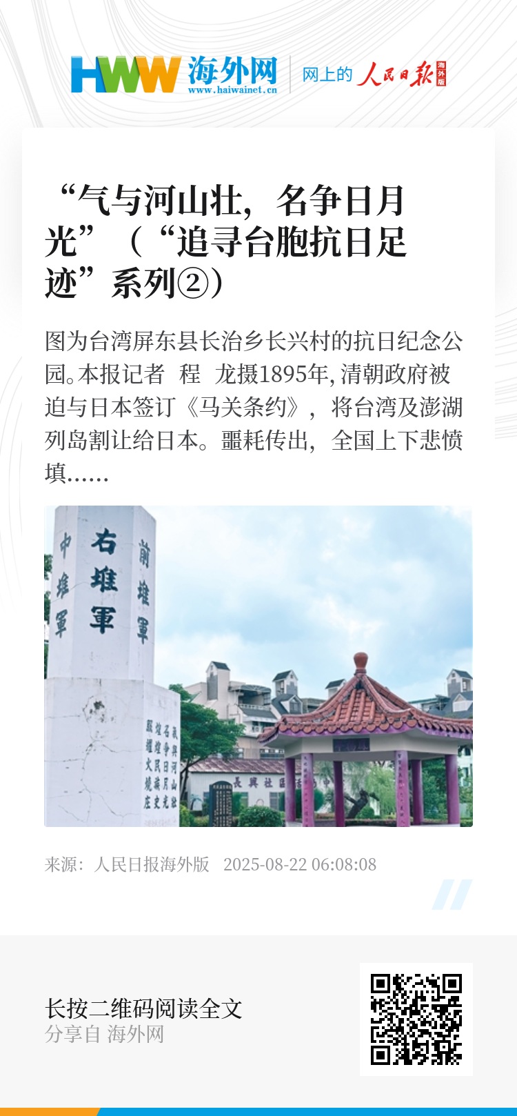 日前,记者走访台湾彰化、屏东等地,在历史的尘烟中,追寻130年前那段血泪交织、共赴国难的峥嵘岁月。