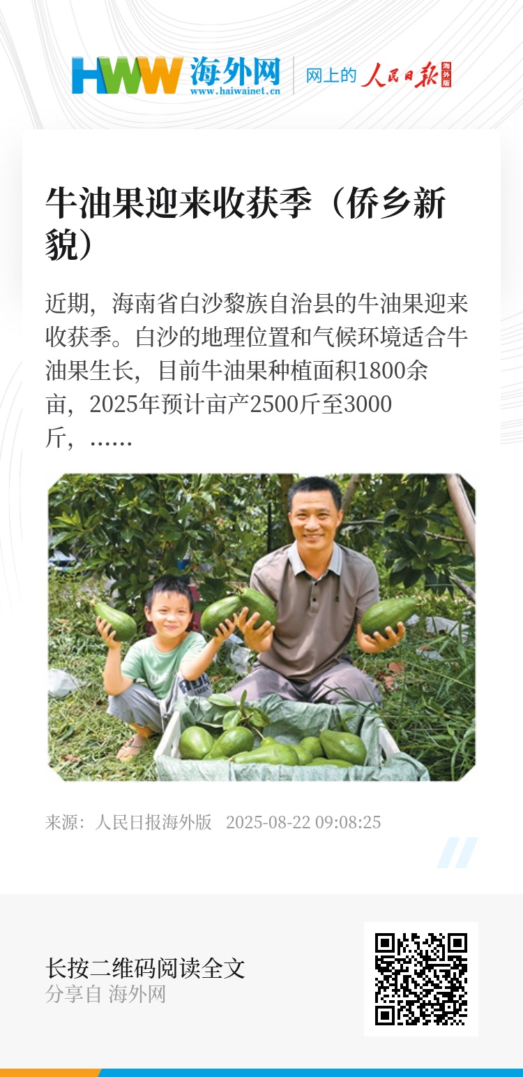 近期,海南省白沙黎族自治县的牛油果迎来收获季。白沙的地理位置和气候环境适合牛油果生长,目前牛油果种植面积1800余亩,2025年预计亩产2500斤至3000斤,每亩效益3万元以上。