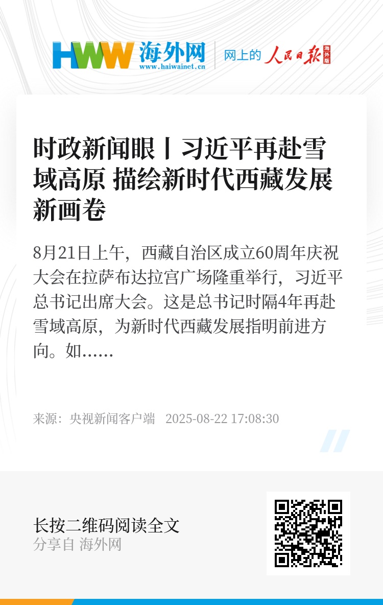 8月21日上午,西藏自治区成立60周年庆祝大会在拉萨布达拉宫广场隆重举行,习近平总书记出席大会。这是总书记时隔4年再赴雪域高原,为新时代西藏发展指明前进方向。如何把握西藏现代化建设新的时代方位?如何共同谱写中国式现代化的绚丽雪域篇章?《时政新闻眼》为你解读。