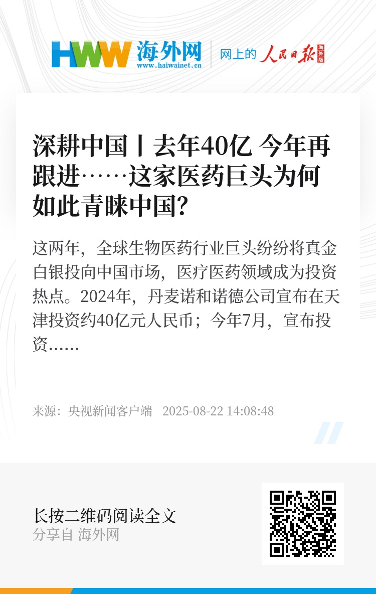 这两年,全球生物医药行业巨头纷纷将真金白银投向中国市场,医疗医药领域成为投资热点。2024年,丹麦诺和诺德公司宣布在天津投资约40亿元人民币;今年7月,宣布投资约8亿元人民币启动天津工厂质量检测实验室扩建项目……这家医药巨头为何如此青睐中国?