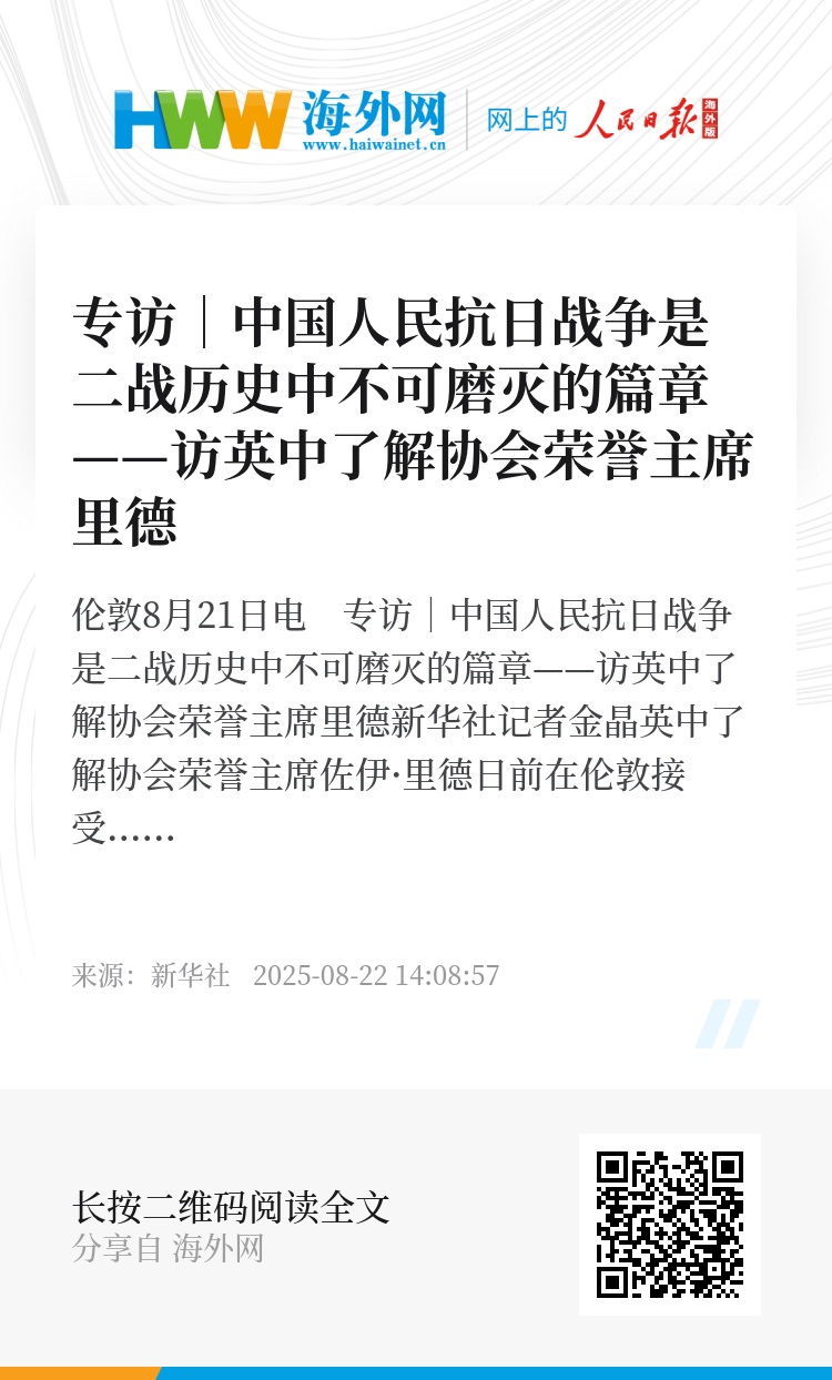 新华社伦敦8月21日电 专访|中国人民抗日战争是二战历史中不可磨灭的篇章——访英中了解协会荣誉主席里德