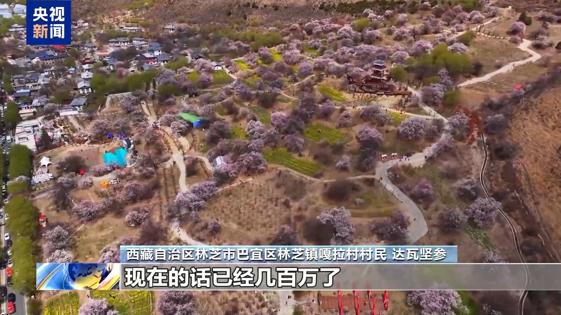 西藏自治区林芝市巴宜区林芝镇嘎拉村村民 达瓦坚参:以前从桃花节开始搞起来的时候,全村收入几百块钱到几千块钱到几万块钱,现在的话已经几百万了。
