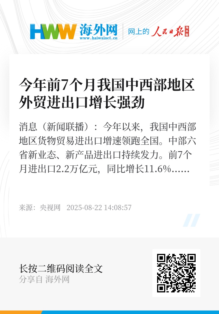 中部六省新业态、新产品进出口持续发力。前7个月进出口2.2万亿元,同比增长11.6%,规模创历史同期新高。