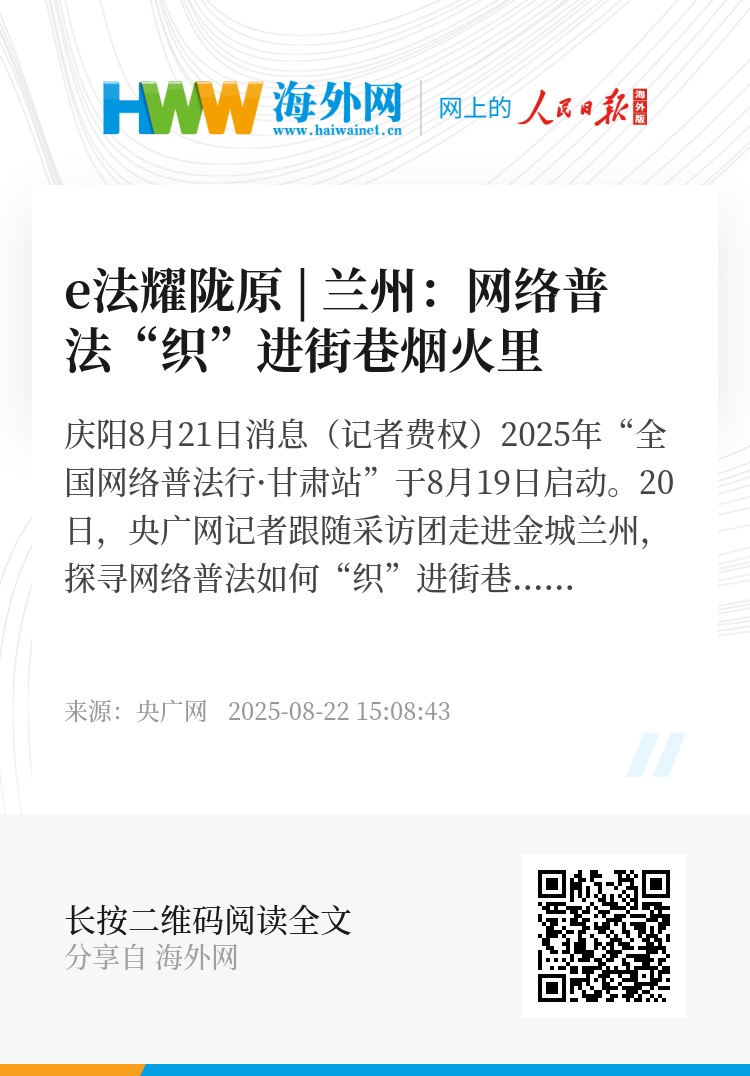 央广网庆阳8月21日消息(记者费权)2025年“全国网络普法行·甘肃站”于8月19日启动。20日,央广网记者跟随采访团走进金城兰州,探寻网络普法如何“织”进街巷烟火里。