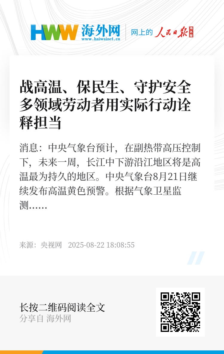 央视网消息:中央气象台预计,在副热带高压控制下,未来一周,长江中下游沿江地区将是高温最为持久的地区。中央气象台8月21日继续发布高温黄色预警。