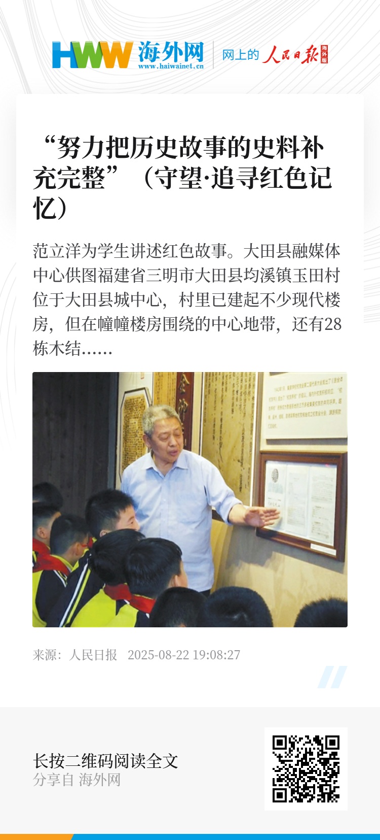 福建省三明市大田县均溪镇玉田村位于大田县城中心,村里已建起不少现代楼房,但在幢幢楼房围绕的中心地带,还有28栋木结构土墙平屋。“这里就是大田‘第二集美学村’旧址。”抚摸着“抗日战争时期玉田‘第二集美学村’旧址”的红色保护牌,范立洋的思绪又回到了1999年,“当年,我跟着曾亲历抗战的几位老人,一座座辨认校舍旧址,安上了这些保护牌。”