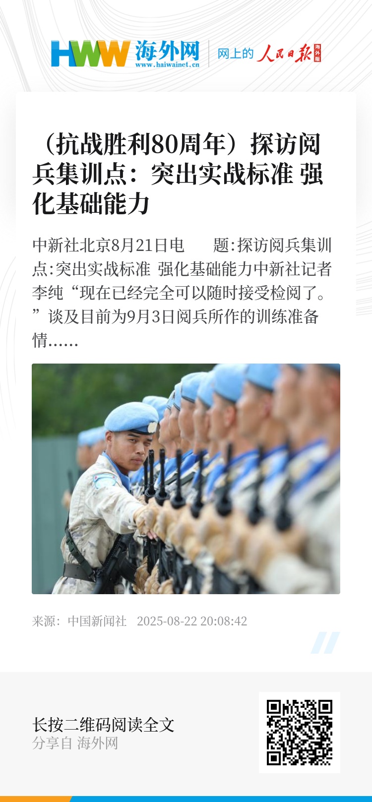 中新社北京8月21日电 题:探访阅兵集训点:突出实战标准 强化基础能力
