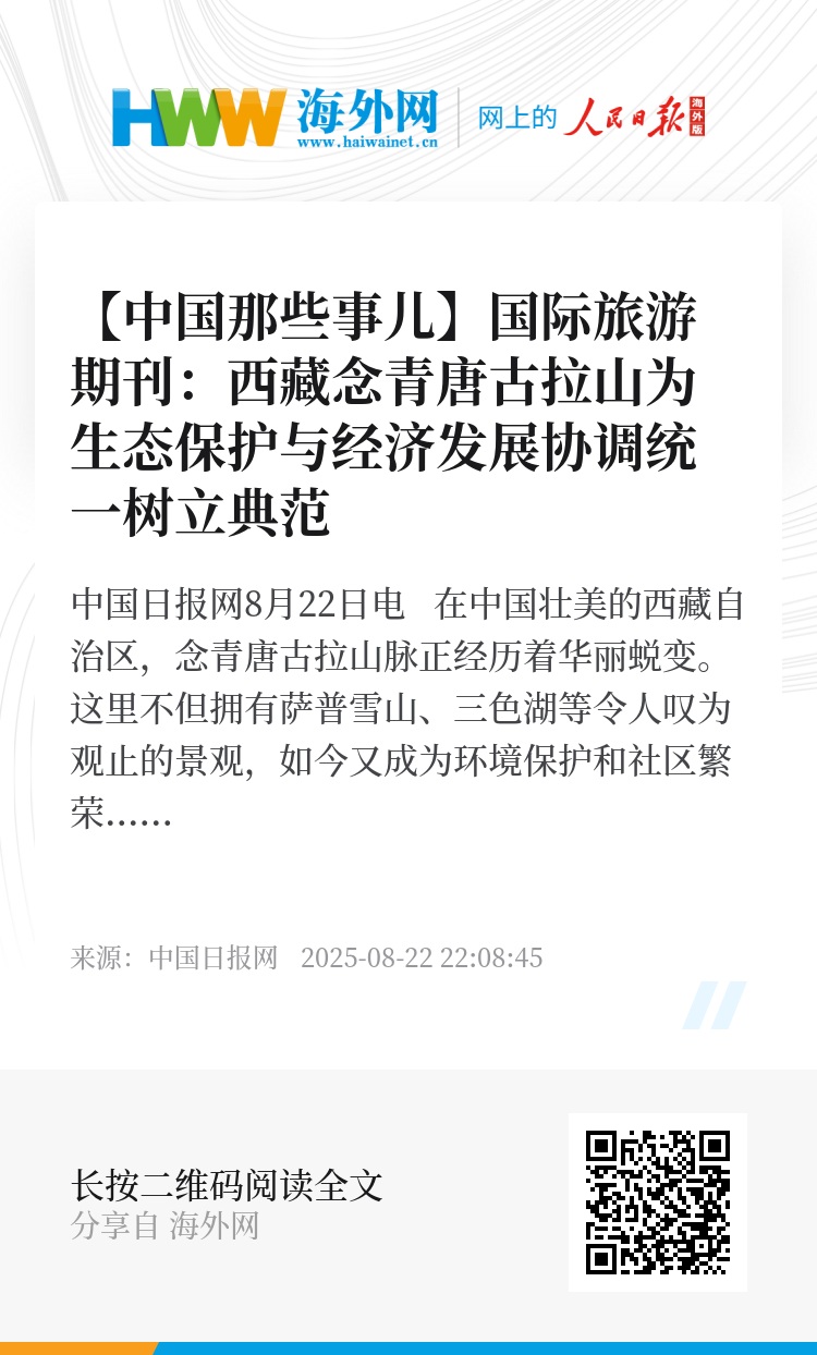 文章写道,西藏念青唐古拉山脉地区的成功实践,为生态保护与经济发展的协调统一提供了范本。这种文化遗产与可持续旅游深度融合的实践模式,既不损害环境和文化资源,又能从旅游业中获益,正为全球其他地区旅游业的发展提供宝贵经验。