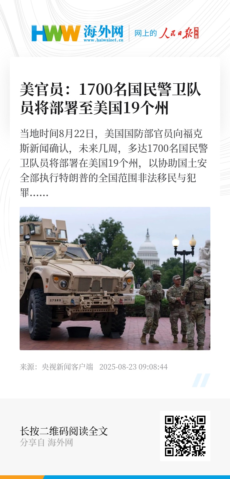 当地时间8月22日,美国国防部官员向福克斯新闻确认,未来几周,多达1700名国民警卫队员将部署在美国19个州,以协助国土安全部执行特朗普的全国范围非法移民与犯罪打击行动。