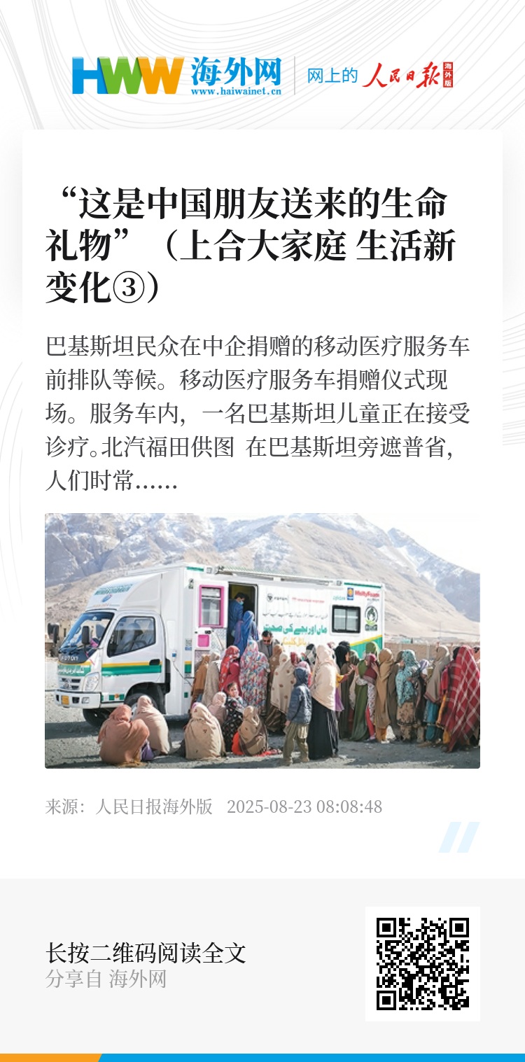“在我们服务的许多村庄,孩子们看到移动医疗服务车会追着喊Chīn dōst(中国朋友),人们称它为China Sehat(中国健康)。”沙希德·阿夫里迪说,“以中巴经济走廊建设为中心,中巴共建‘一带一路’取得了丰硕成果,两国在经济、文化等领域的沟通合作不断加深。我能深切感受到,共建‘一带一路’的宏大叙事真正融入到了民众的日常生活中。”