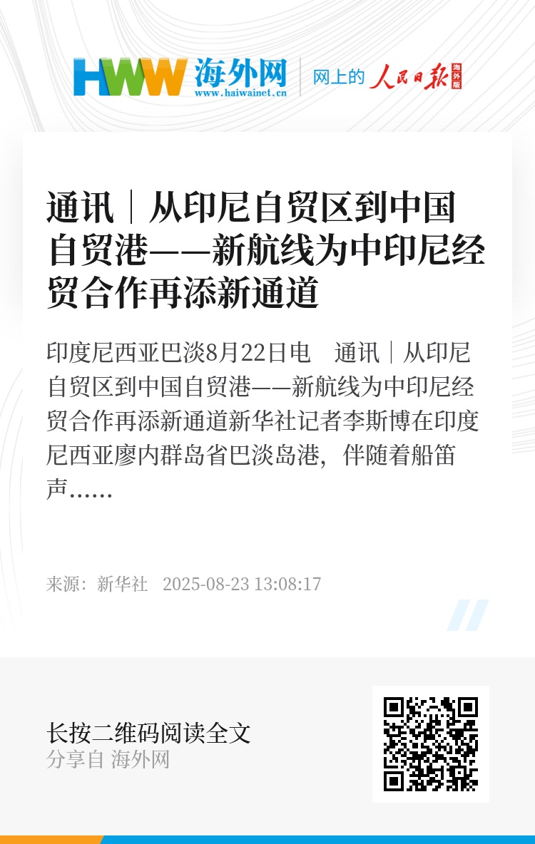 新华社印度尼西亚巴淡8月22日电 通讯|从印尼自贸区到中国自贸港——新航线为中印尼经贸合作再添新通道
