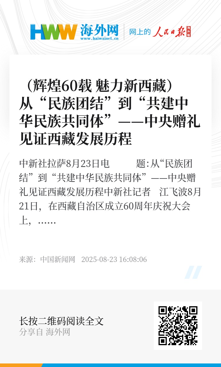 8月21日,在西藏自治区成立60周年庆祝大会上,中央代表团向西藏自治区赠送“共建中华民族共同体 书写美丽西藏新篇章”贺匾。接受中新社记者采访的学者指出,中央赠礼主题的演变清晰展现了治藏方略从“稳藏”到“兴藏”的演变,体现了对铸牢中华民族共同体意识和生态文明建设的高度重视。这一延续数十年的赠礼传统,成为观察西藏发展进步的重要窗口。