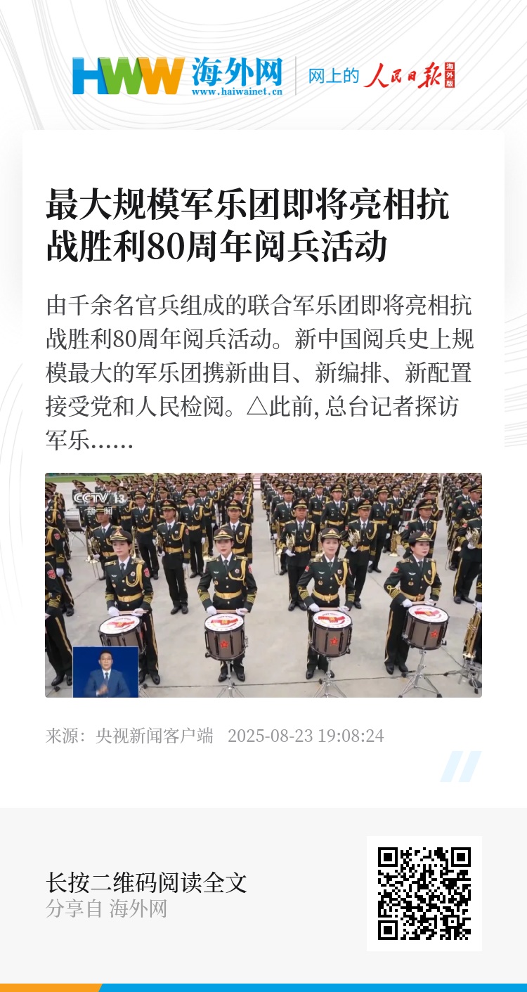 由千余名官兵组成的联合军乐团即将亮相抗战胜利80周年阅兵活动。新中国阅兵史上规模最大的军乐团携新曲目、新编排、新配置接受党和人民检阅。