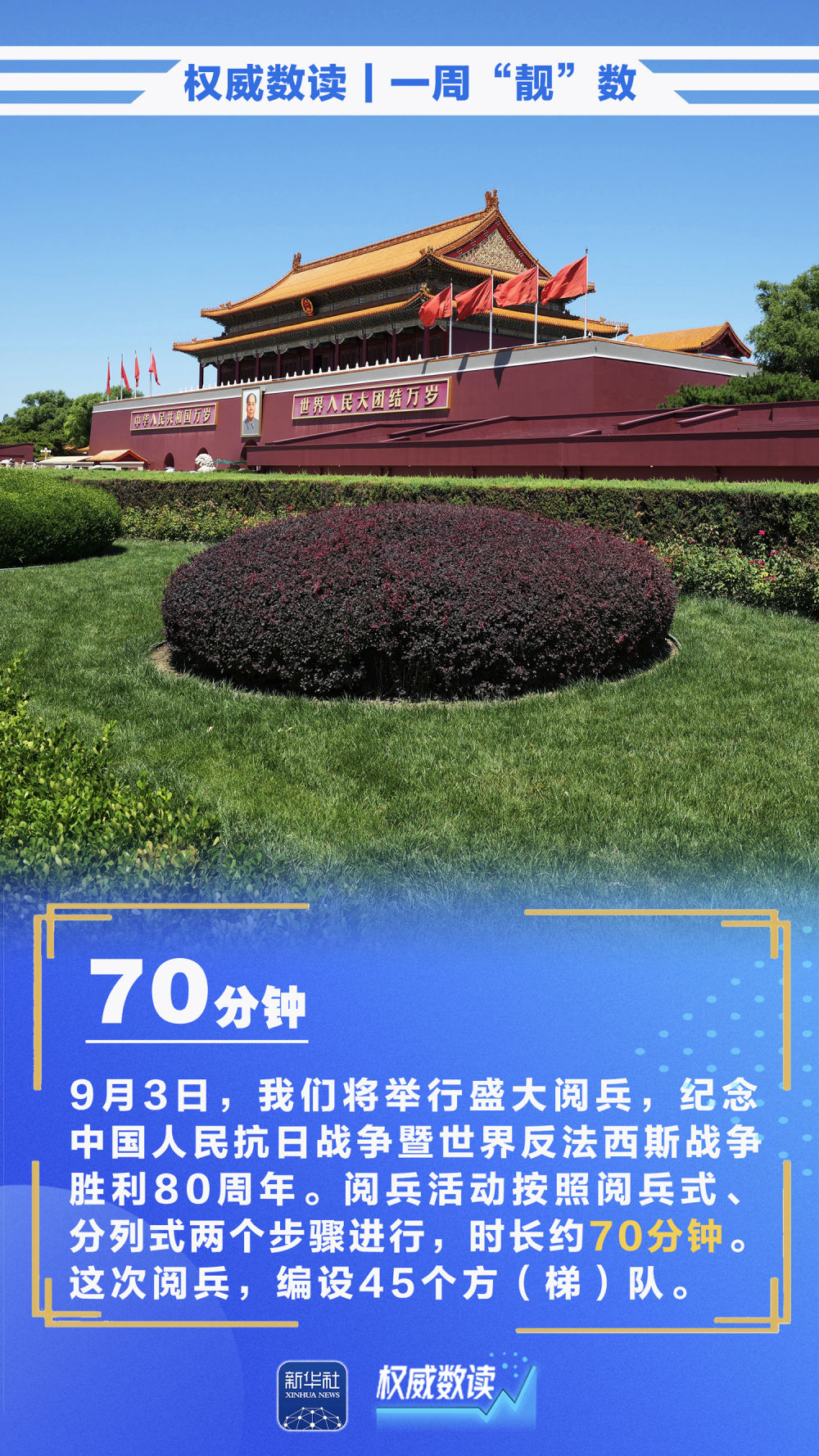 即将到来的九三阅兵活动按照阅兵式、分列式两个步骤进行,时长约70分钟;我国外贸保持稳中有进态势,累计进出口增速逐月回升,前7个月实现3.5%的增长;今年前7个月,我国对上海合作组织其他成员国进出口2.11万亿元,规模创历史同期新高……本周这些数据,最值得关注!
