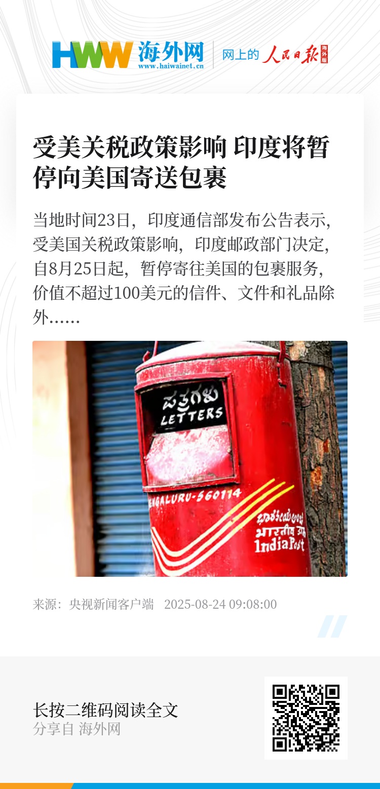 当地时间23日,印度通信部发布公告表示,受美国关税政策影响,印度邮政部门决定,自8月25日起,暂停寄往美国的包裹服务,价值不超过100美元的信件、文件和礼品除外。