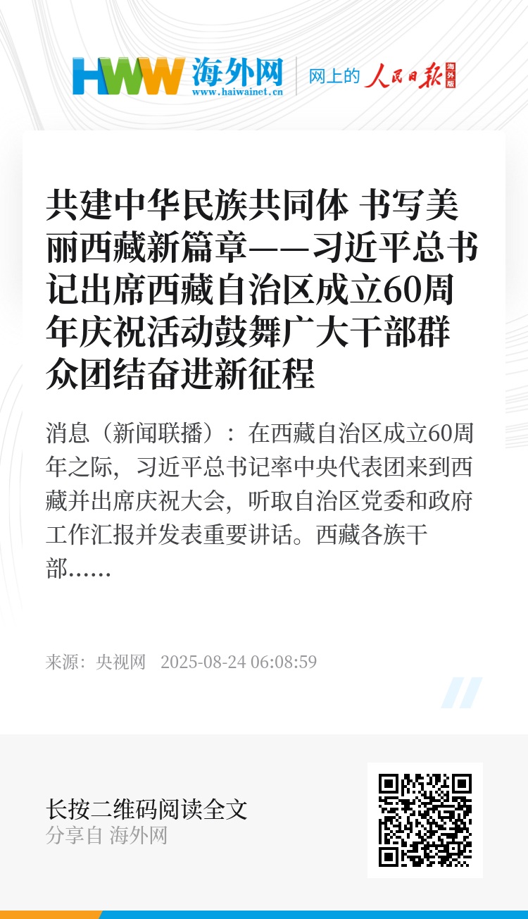 央视网消息(新闻联播):在西藏自治区成立60周年之际,习近平总书记率中央代表团来到西藏并出席庆祝大会,听取自治区党委和政府工作汇报并发表重要讲话。西藏各族干部群众欢欣鼓舞、倍感温暖。大家表示,站在新的历史起点,要坚持以习近平新时代中国特色社会主义思想为指导,不断铸牢中华民族共同体意识,团结奋进中国式现代化新征程。