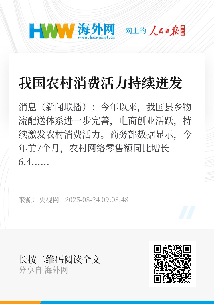 商务部数据显示,今年前7个月,农村网络零售额同比增长6.4%,不断丰富的商品服务供给,让农民足不出户就能买到物美价廉的商品,农村消费市场不断繁荣。