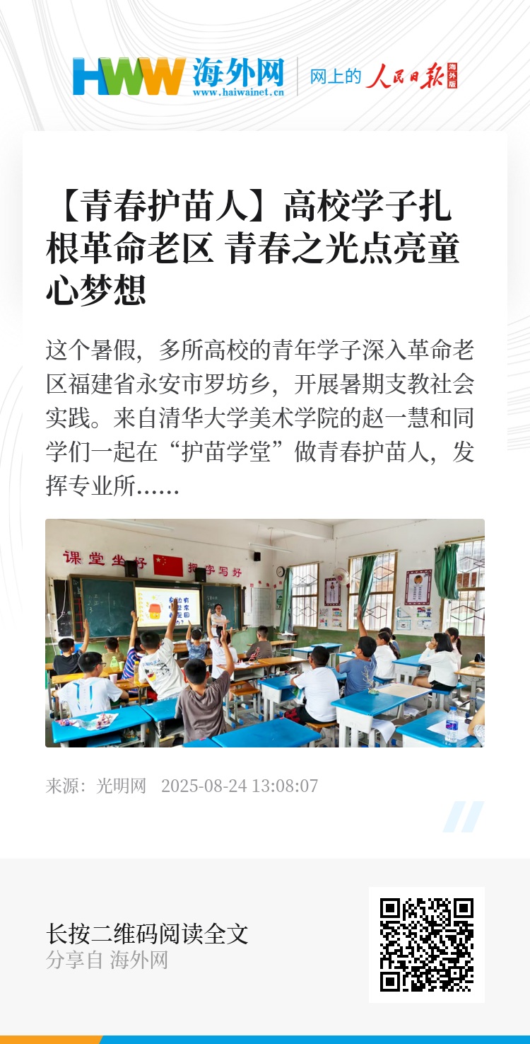 这个暑假,多所高校的青年学子深入革命老区福建省永安市罗坊乡,开展暑期支教社会实践。来自清华大学美术学院的赵一慧和同学们一起在“护苗学堂”做青春护苗人,发挥专业所长,服务乡村教育,为乡村少年儿童耕心田、育梦想。