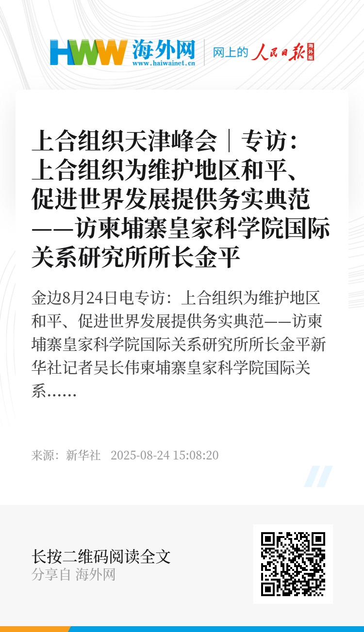 新华社金边8月24日电专访:上合组织为维护地区和平、促进世界发展提供务实典范——访柬埔寨皇家科学院国际关系研究所所长金平
