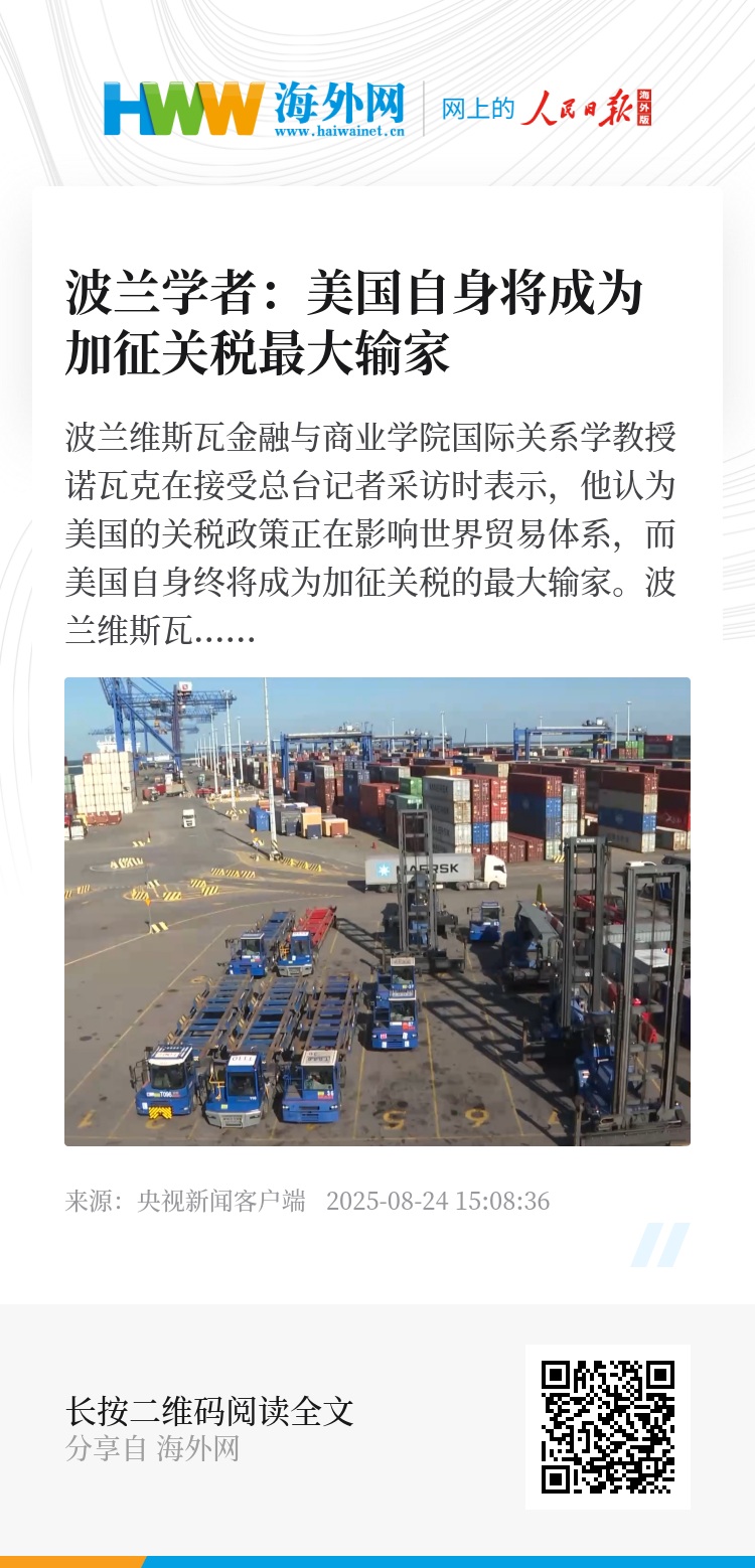 波兰维斯瓦金融与商业学院国际关系学教授诺瓦克在接受总台记者采访时表示,他认为美国的关税政策正在影响世界贸易体系,而美国自身终将成为加征关税的最大输家。