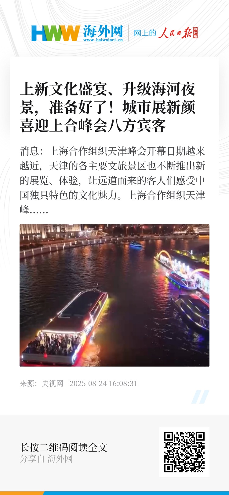 央视网消息:上海合作组织天津峰会开幕日期越来越近,天津的各主要文旅景区也不断推出新的展览、体验,让远道而来的客人们感受中国独具特色的文化魅力。