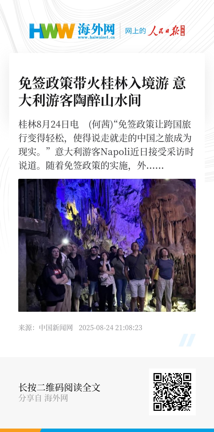 中新网桂林8月24日电 (何茜)“免签政策让跨国旅行变得轻松,使得说走就走的中国之旅成为现实。”意大利游客Napoli近日接受采访时说道。