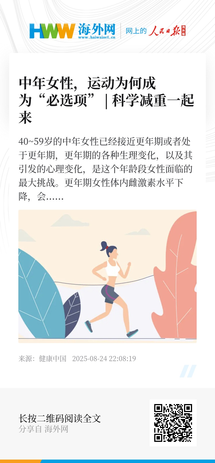 科学运动有助于减轻上述症状,帮助女性从容度过这一特殊时期。中华医学会妇产科学分会绝经学组给了更年期女性有针对性的运动建议:每周进行规律有氧运动3~5次,每周累计150分钟,加上2~3次肌肉强化运动,以增加肌肉量和肌力。